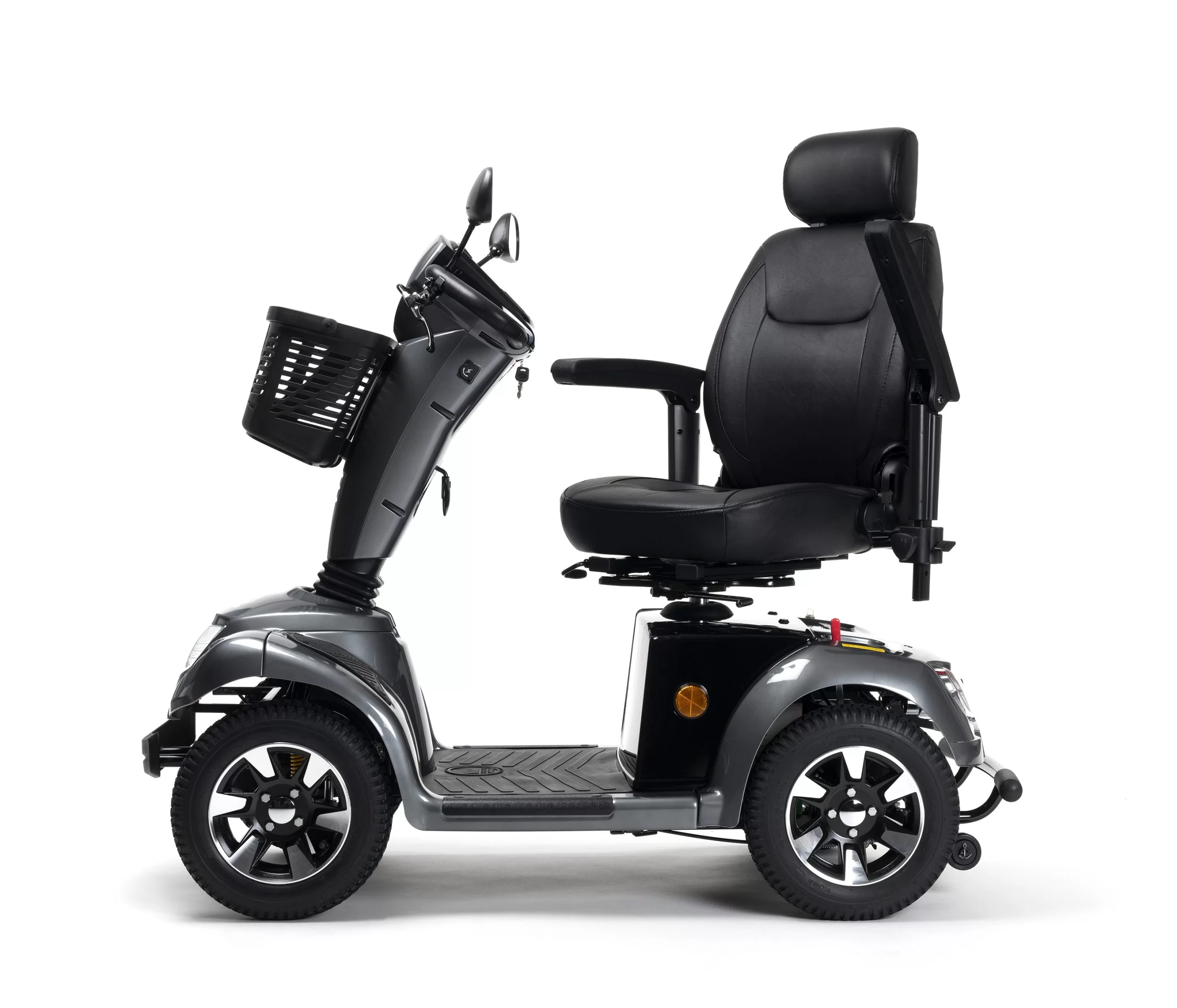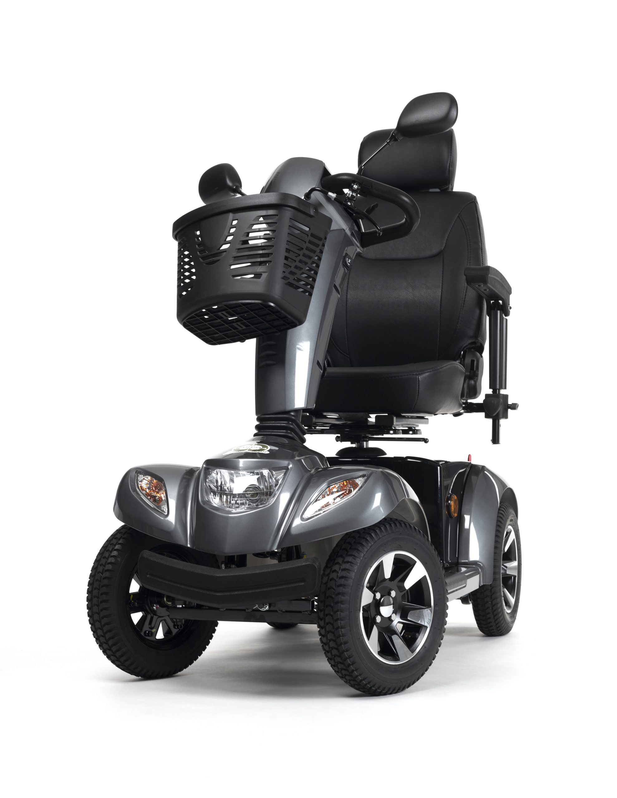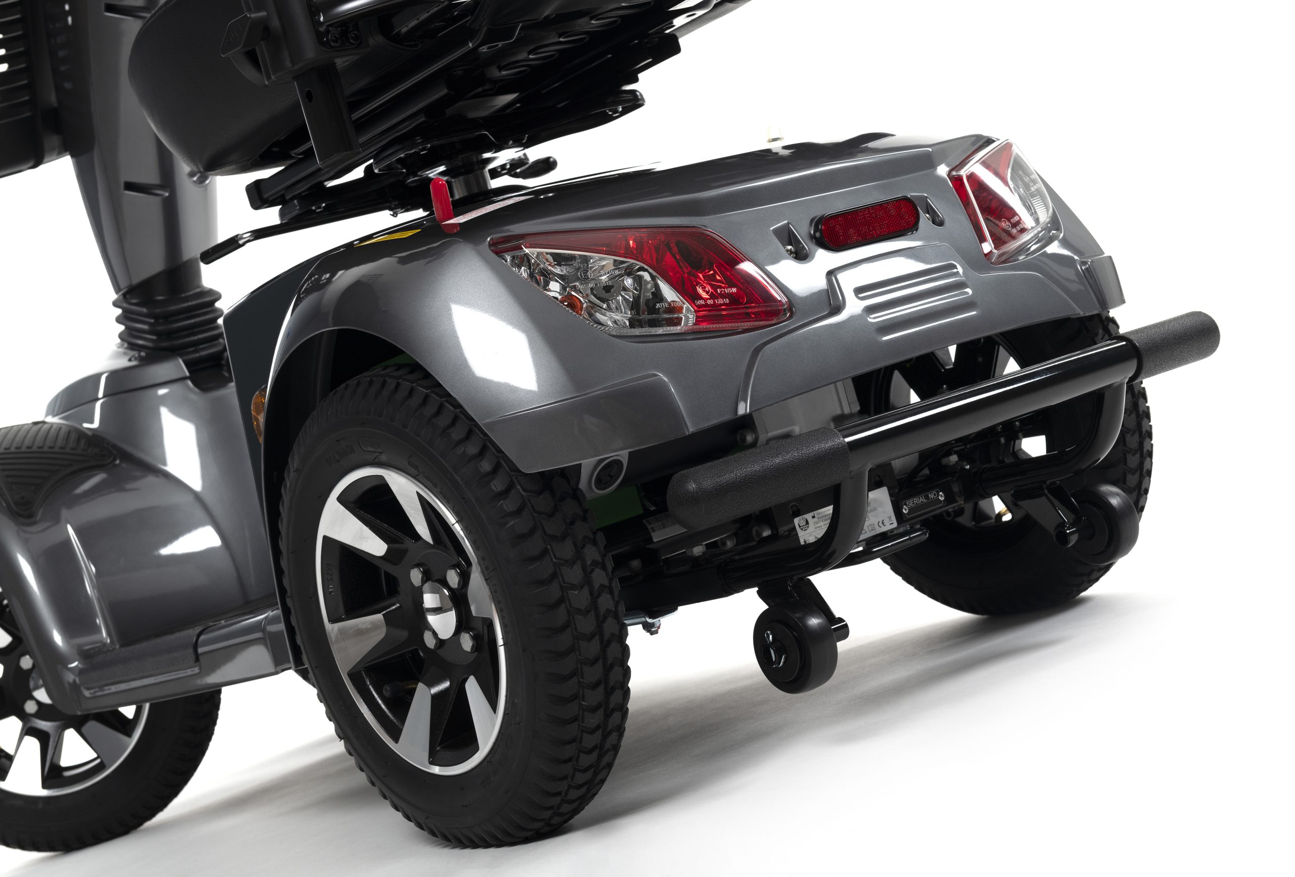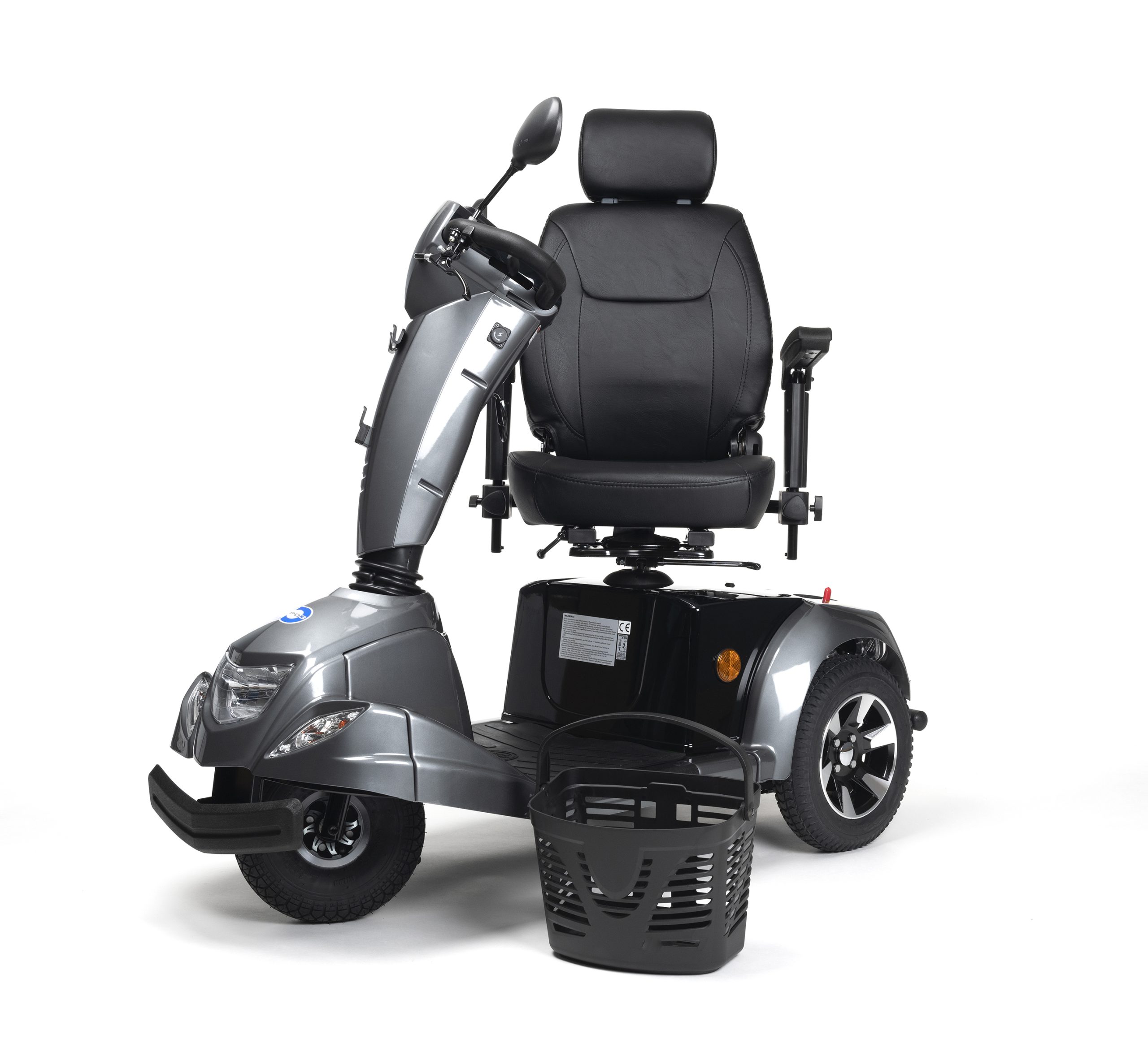 Een vierwielige scootmobiel met extra stabiliteit en comfort, perfect voor gebruikers die vaak buiten rijden en behoefte hebben aan extra ondersteuning.
